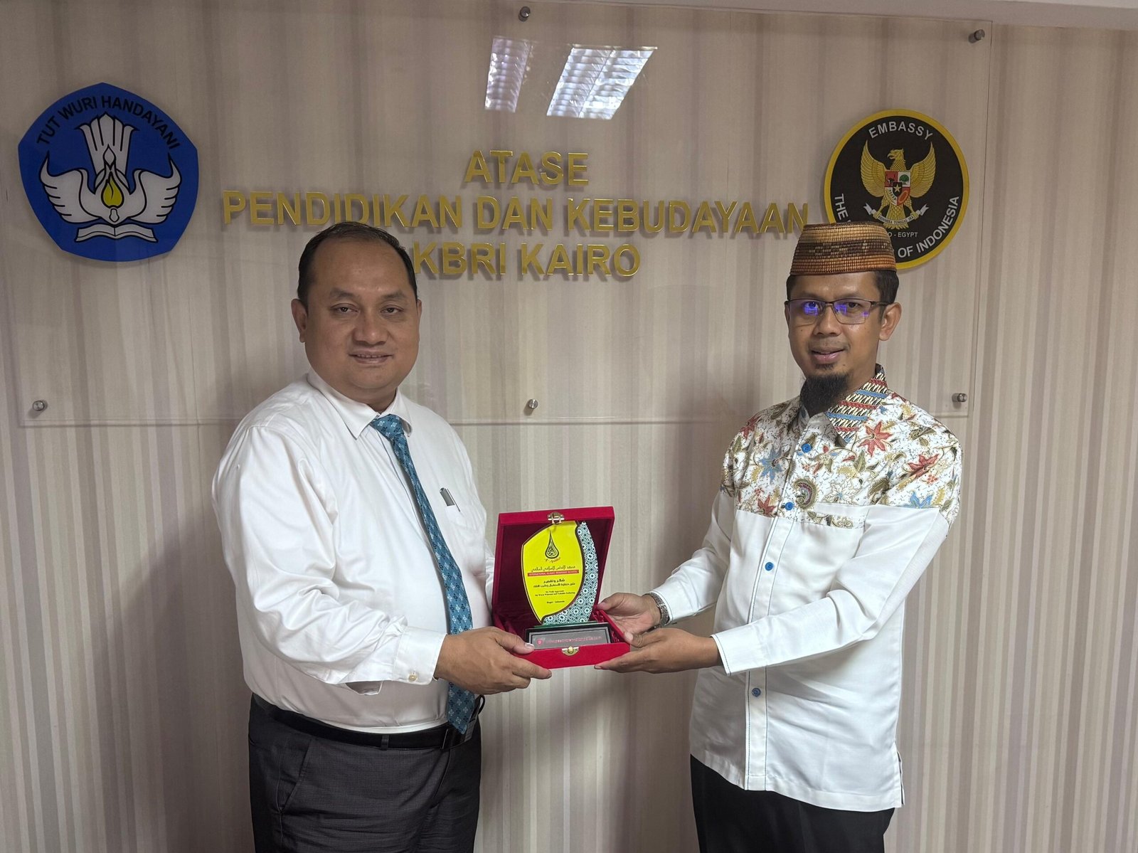 Mudir 'Am Pesantren Al-Andalus, Ustaz Nurdin Apud Sarbini, Lc., M.Pd saat menyerahkan cendera mata kepada Atdikbud KBRI Kairo, Dr. Abdul Muta’ali, M.A., M.I.P., Ph.D di kantor KBRI Kairo, Mesir, Rabu (1/10/2025)