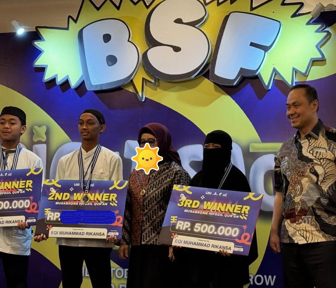 Santri Pesantren Islam Internasional Al-Andalus kelas XI C, Muhammad Adriano Pradipto (kedua, kiri) mendapatkan apresiasi setelah menjuarai MHQ dalam ajang Bright Society Fest (BSF) 2025 Competition' pada 13 Desember 2025 di Universitas Ary Ginanjar (UAG), Jakarta.